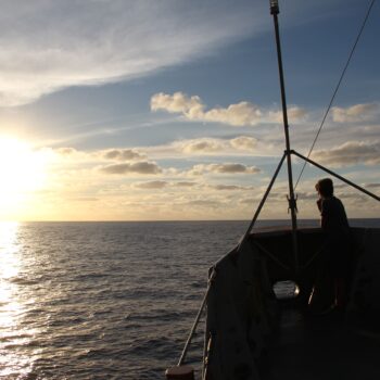 Contemplación del horizonte al atardecer, desde la proa de un barco que navega por el océano Pacífico rumbo a la isla Socorro.
