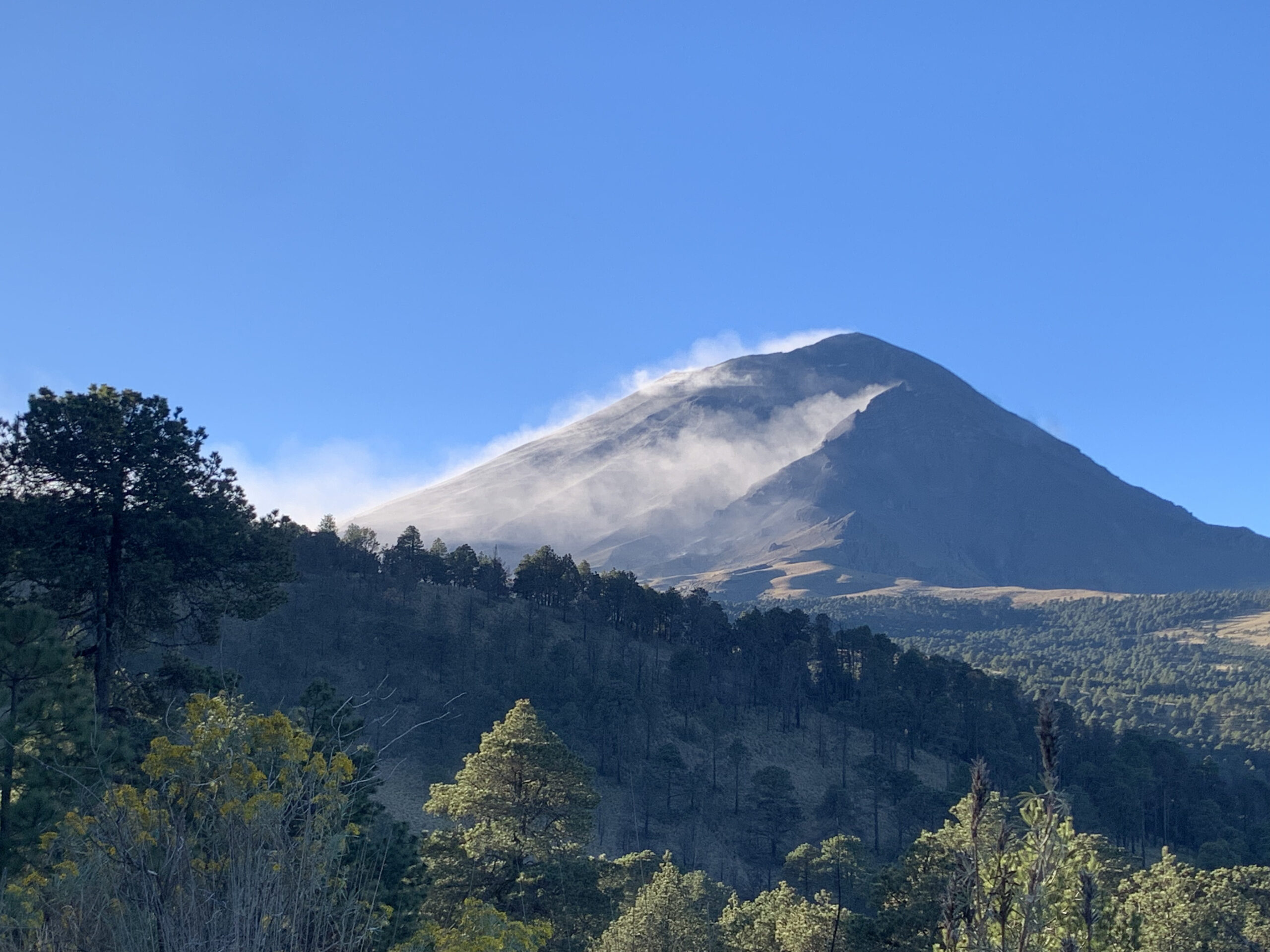 Episodio de actividad fumarólica del volcán Popocatépetl tomado desde el camino Xalitzintla-Paso de Cortés, en la mañana del 15 de marzo del 2025.