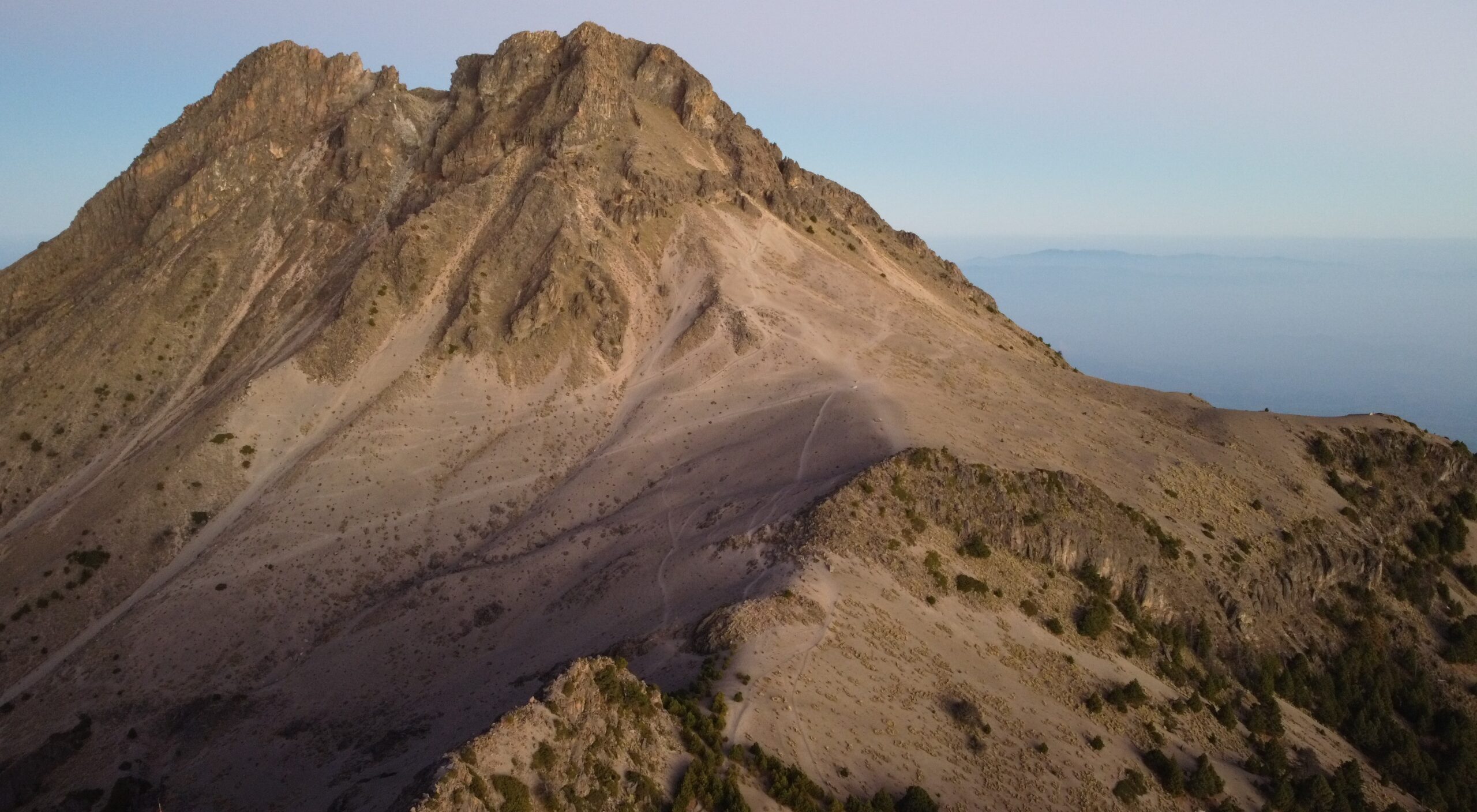 Toma aérea del Nevado de Colima durante el atardecer, donde la luz revela tanto la composición como el relieve que modelan su superficie.