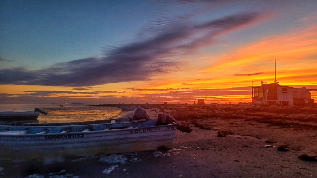 Description: Foto tomada de un amanecer tojo intenso en laguna Ojo de Liebre. En un primer plano se observa una lancha descansando en una planicie de marea durante la bajamar.