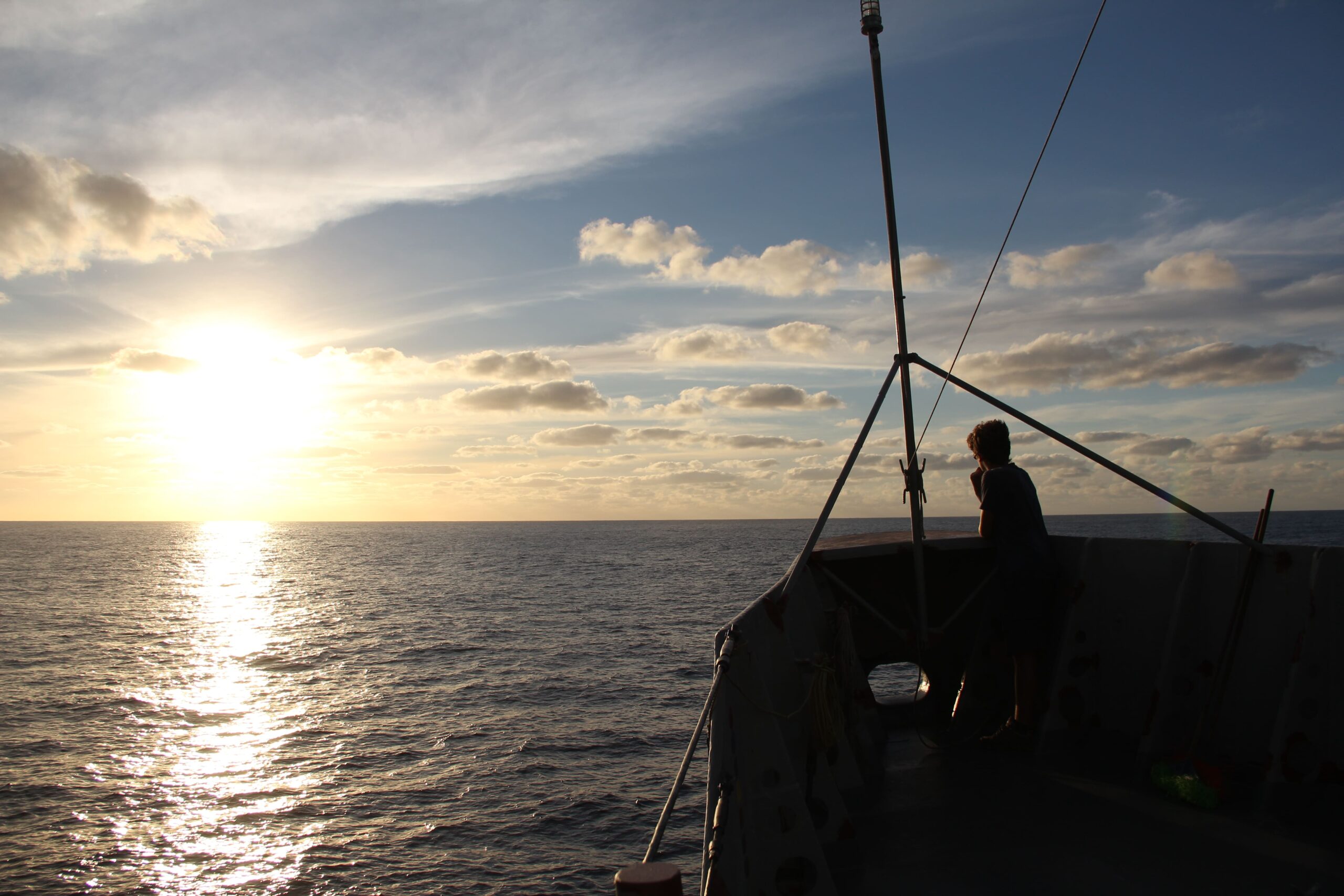 Contemplación del horizonte al atardecer, desde la proa de un barco que navega por el océano Pacífico rumbo a la isla Socorro.
